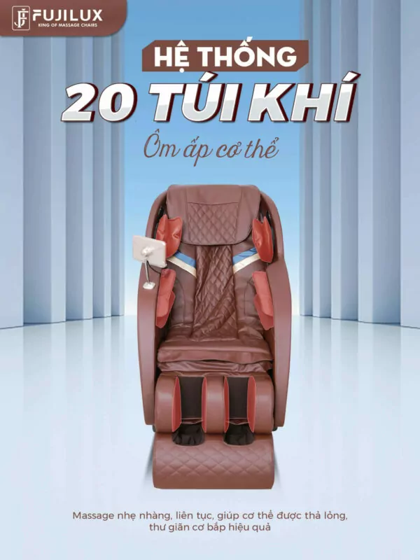 Ghế massage FUJILUX PT607 có hệ thống 20 túi khí được phân bổ đều và nối liền tại vùng vai, tay, bắp chân để ôm trọn toàn thân cùng khả năng điều chỉnh cường độ mạnh – nhẹ – vừa phải theo đúng nhu cầu người dùng. Các túi khí thực hiện động tác bơm nén – xả khí nhịp nhàng theo chu kỳ dựa trên các phương pháp vật lý trị liệu để giúp xua tan cơn đau nhức cơ bắp và giảm tê bì tay chân hiệu quả. Đồng thời, tính năng này còn giúp hỗ trợ quá trình lưu thông máu đi khắp cơ thể, đặc biệt phù hợp với người lớn tuổi.