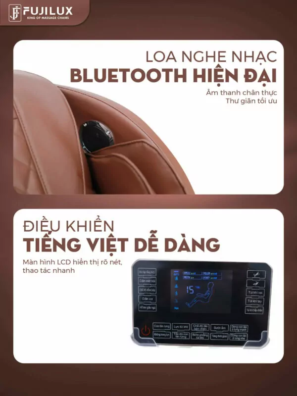- Loa âm thanh kết nối Bluetooth hiện đại: Ghế massage Fuji Luxury PT607 PT607 sẽ mang đến cho bạn giây phút thư giãn tuyệt vời với hệ thống âm thanh sống động khi được kết nối Bluetooth thông minh.