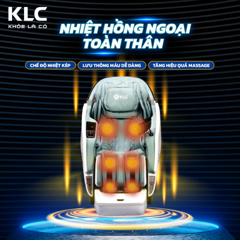 Nhiệt hồng ngoại của KLC K7979 được thiết kế ở phần lưng, bắp chân và bàn chân với cường độ khác nhau giúp cung cấp một lượng nhiệt đến các điểm trên cơ thể từ đó tăng hiệu quả massage lên gấp nhiều lần. Từ đó giúp giảm đau lưng, đốt sống, đĩa đệm; thúc đẩy trao đổi chất, cải thiện giấc ngủ, đặc biệt là nới lỏng và thư giãn cơ bắp, lưu thông tuần hoàn máu được tốt hơn.