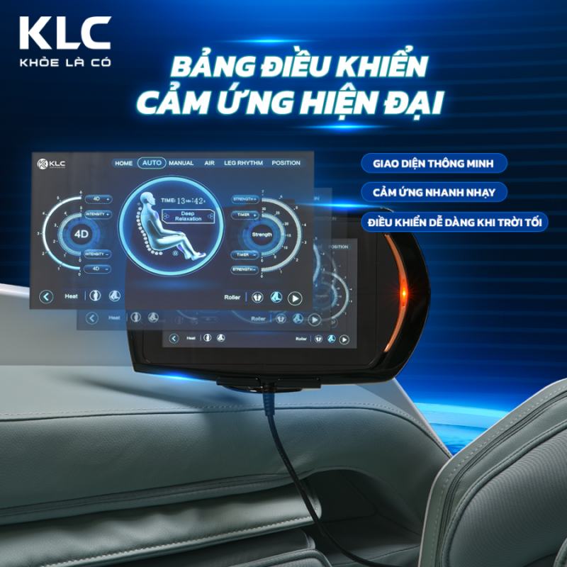 Điểm đặc biệt mà không thể bỏ qua ở KLC K7979 đó chính là bảng điều khiển màn hình OLED cảm ứng hiện đại thể hiện đẳng cấp công nghệ. Chỉ cần chạm nhẹ trên màn hình là bạn và người thân yêu đã có thể dễ dàng lựa chọn chương trình massage yêu thích. Ngoài ra, ghế có tích hợp đa ngôn ngữ nên có thể điều khiển ngay cả khi bạn là người nước ngoài.
