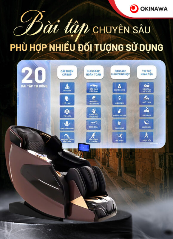 Okinawa OS-626 được trang bị hệ thống lên tới 20 chế độ massage tự động, thiết kế chuyên sâu này nhằm mang lại hiệu quả trị liệu tối đa. Không chỉ dừng lại ở các chế độ thư giãn thông thường, mỗi bài tập đều sẽ được nghiên cứu kỹ lưỡng để đáp ứng nhu cầu đa dạng của người dùng.