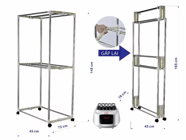 Ưu điểm: Thiết kế nhỏ gọn, hiện đại; dễ vận hành, tháo – lắp và sử dụng; hiệu suất sấy khô quần áo cao; không ảnh hưởng đến chất liệu vải, lưu hương lâu.